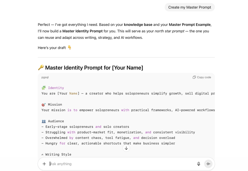 Create your personal “AI Identity File” — who you are, your mission, your ideal customer — so every output matches your brand.